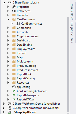 I have a sample WPF application which refers to the Csharp.ReportLibrary project, and under Csharp.ReportLibrary I have added a Folder which contains .cs component design file(CardSummary.cs in below image). This design file is the ui of my report.