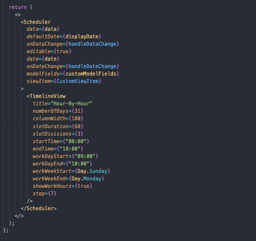 I am currently doing research and exploring the capabilities of the TimelineView component. Part of the requirements of a project I'm working on is that we can schedule events that span a period of weeks and view the scheduled events. In the attached screenshot the date headers I am referencing start with Jun 23. I have also attached a screenshot of the components I am working with.