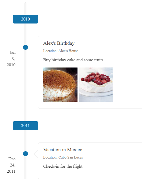 I have two events, one on 2010 and another in 2011. My timeline will be split in two parts using a marker containing the year. Something like this:
