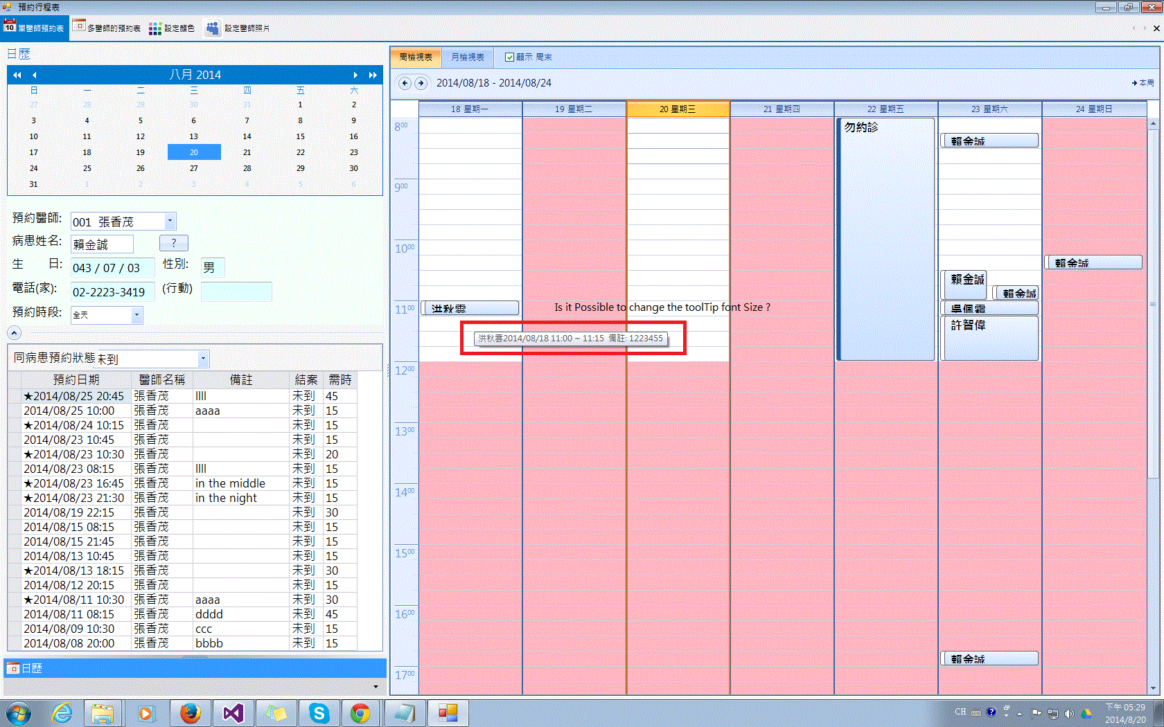 protected override void OnLoad(EventArgs e){ base.OnLoad(e); InitializeComponent(); AddScheduler(); radScheduler1.ToolTipTextNeeded += radScheduler1_ToolTipTextNeeded;}string schedulerToolTip = "toolTipText";void radScheduler1_ToolTipTextNeeded(object sender, ToolTipTextNeededEventArgs e){ e.ToolTipText = schedulerToolTip; e.ToolTip.OwnerDraw = true; e.ToolTip.Popup -= ToolTip_Popup; e.ToolTip.Popup += ToolTip_Popup; e.ToolTip.Draw -= ToolTip_Draw; e.ToolTip.Draw += ToolTip_Draw;}void ToolTip_Popup(object sender, PopupEventArgs e){ e.ToolTipSize = TextRenderer.MeasureText(schedulerToolTip, new Font("Arial", 16.0f)); Console.WriteLine(e.ToolTipSize);}void ToolTip_Draw(object sender, DrawToolTipEventArgs e){ using (e.Graphics) { Font f = new Font("Arial", 16.0f); e.DrawBackground(); e.DrawBorder(); schedulerToolTip = e.ToolTipText; e.Graphics.DrawString(e.ToolTipText, f, Brushes.Red, new Point(2,2)); }}Note that due to the fact the ToolTipText needed is fired upon hovering an element in the control, I am first unsubscribing from the events prior subscribing, in order to avoid multiple subscriptions.