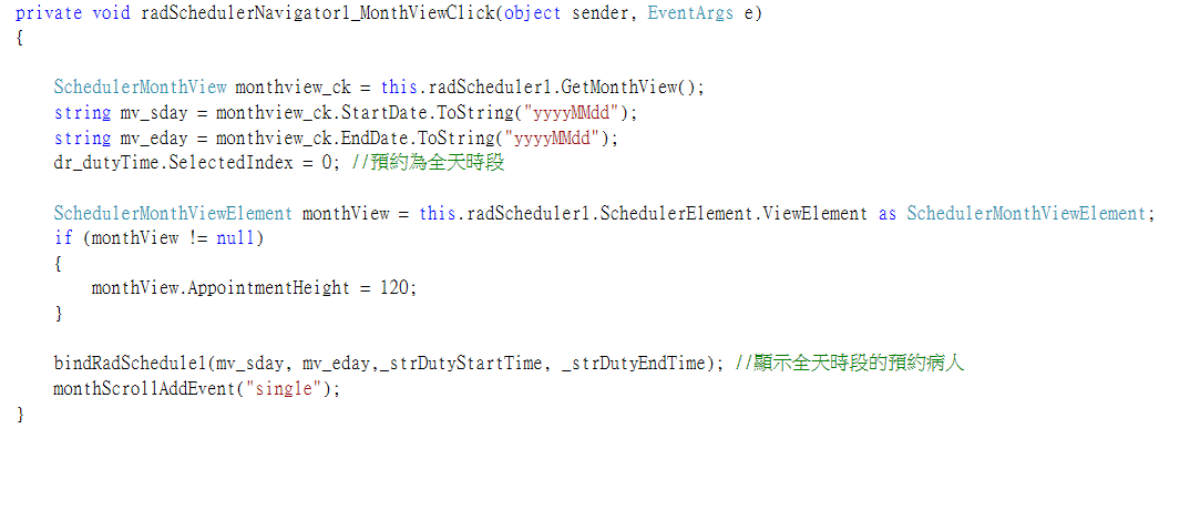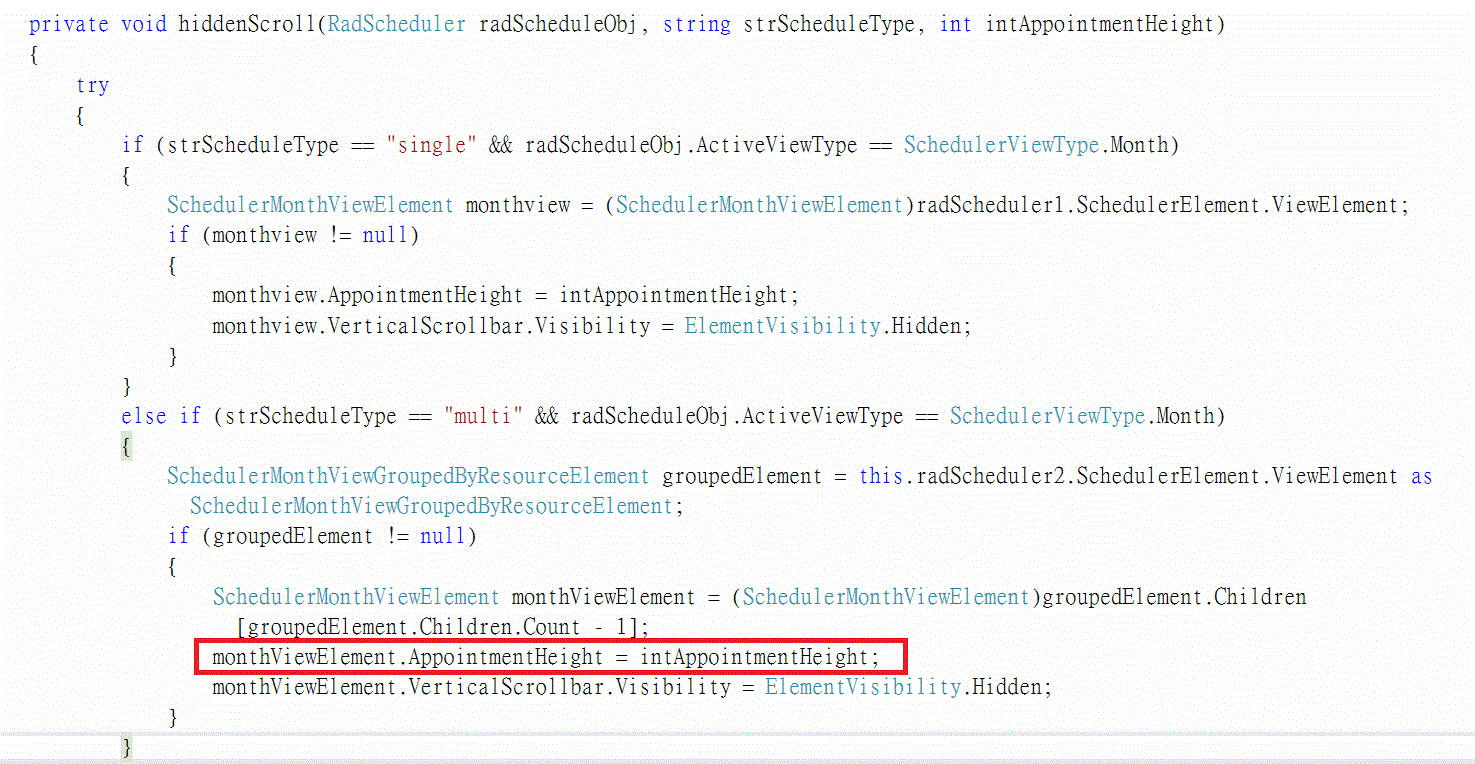 private void radButton1_Click(object sender, EventArgs e){ SchedulerMonthViewGroupedByResourceElement groupedElement = this.radScheduler1.SchedulerElement.ViewElement as SchedulerMonthViewGroupedByResourceElement; if (groupedElement != null) { foreach (RadElement currentElement in groupedElement.Children) { SchedulerMonthViewElement monthViewElement = currentElement as SchedulerMonthViewElement; if (monthViewElement != null) { monthViewElement.AppointmentHeight = 50; } } }}I hope that you find this information useful.