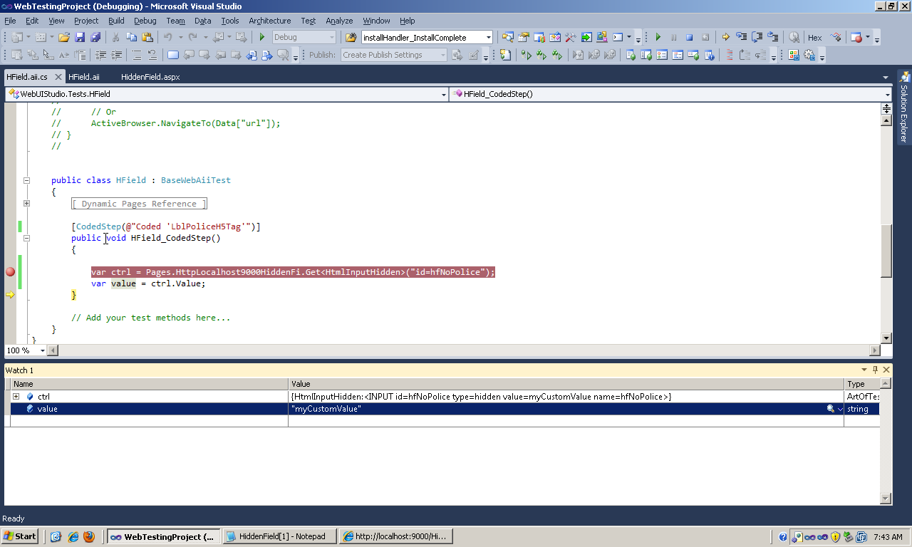 [CodedStep(@"GetValue 'myHiddenField'")]public void HiddenField_CodedStep(){ //Get Hidden field by id var hiddenFieldControl = Pages.HttpLocalhost9000HtmlHid.Get<HtmlInputHidden>("id=myHiddenField"); var fieldValue = hiddenFieldControl.Value;}Please note that "HttpLocalhost9000HtmlHid" is the page that is currently in use in my test yours will be different. If that page does not contain the hidden element the test step will fail.