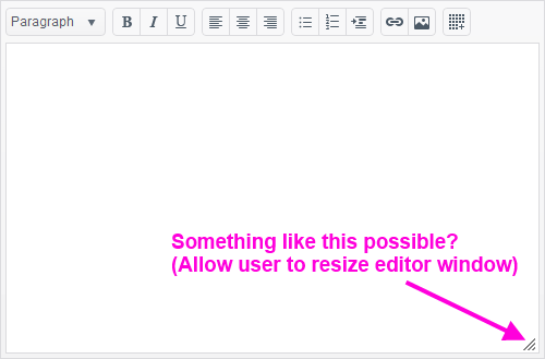Successfully using the HTML Editor, I would like to give my users the ability to resize the editor window (like shown in the attachment scribble).