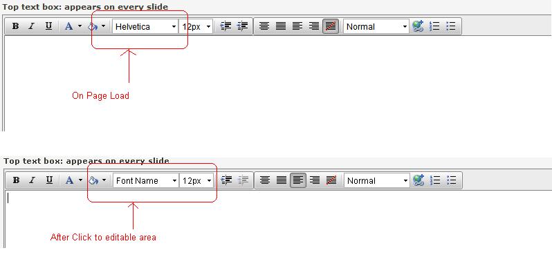 Everything is fine. on page load font has been set. But ASA I click on editable area, default font ('Arial') changed with 'Font Name'.