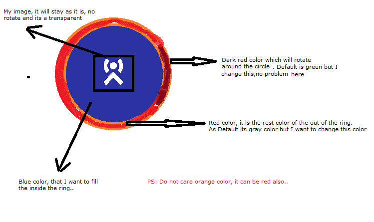 The second problem is, as you see the picture that I attached, the ring has 2 colors. From dark red to light red and then white.. Is it possible to do that kind of circle? I am trying to do same thing as the picture. As I read the article regarding busyindicator, it said that I can customize how I want.. But even I cannot change the circle color how I want..