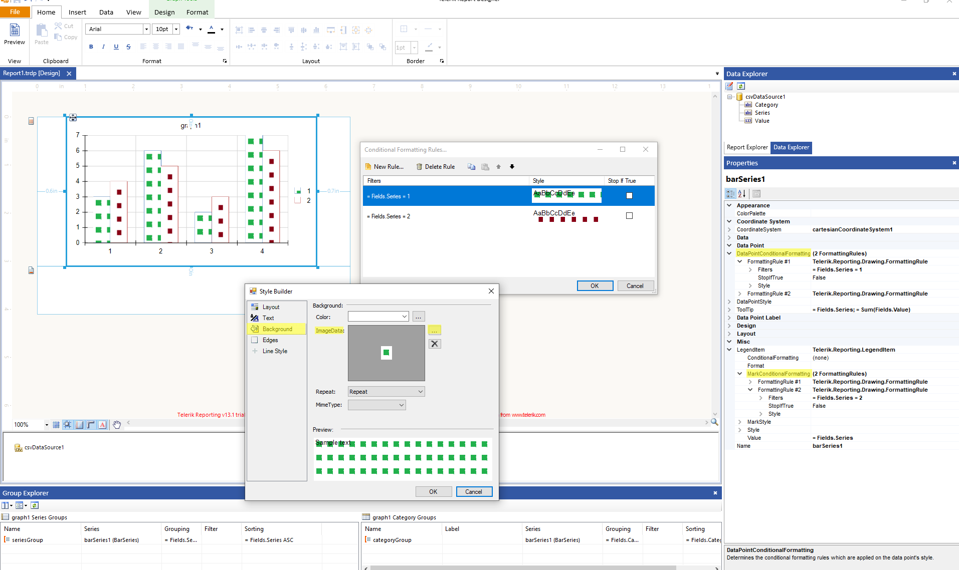 I will suggest a workaround for the requirement. You may use the Background Image of the barSeries with an image that mimics the hatch/dot shading (e.g. a small dot in Repeat mode) and set it through conditional formatting. Here are some sample steps : 1. Select barSeries -> Data Point -> DataPointConditionalFormatting -> click on the ellipses - the Conditional Formatting Rules wizard will pop-up 2. Add new Rule with Filters specifying which bars will be displayed with the same background image, e.g. each Series group may have its own background/hatch 3. Specify what background image to be used with each Series under the Style of the corresponding Filter 4. Select barSeries -> LegendItem -> MarkConditionalFormatting -> click on the ellipses - Conditional Formatting Rules wizard will pop-up 5. Repeat 2 and 3 for the Mark. These steps are necessary for setting the correct Legend items images for the Series.