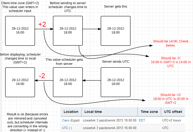 In my computer I have currently timezone UTC+2. When I adding a new event and set start date to 17:10 (5:10 PM) it is send to server as 19:10 (7:10 PM). I think that scheduler should send to server 15:10 value (3:10 PM). Is it bug in scheduler or in my understanding?