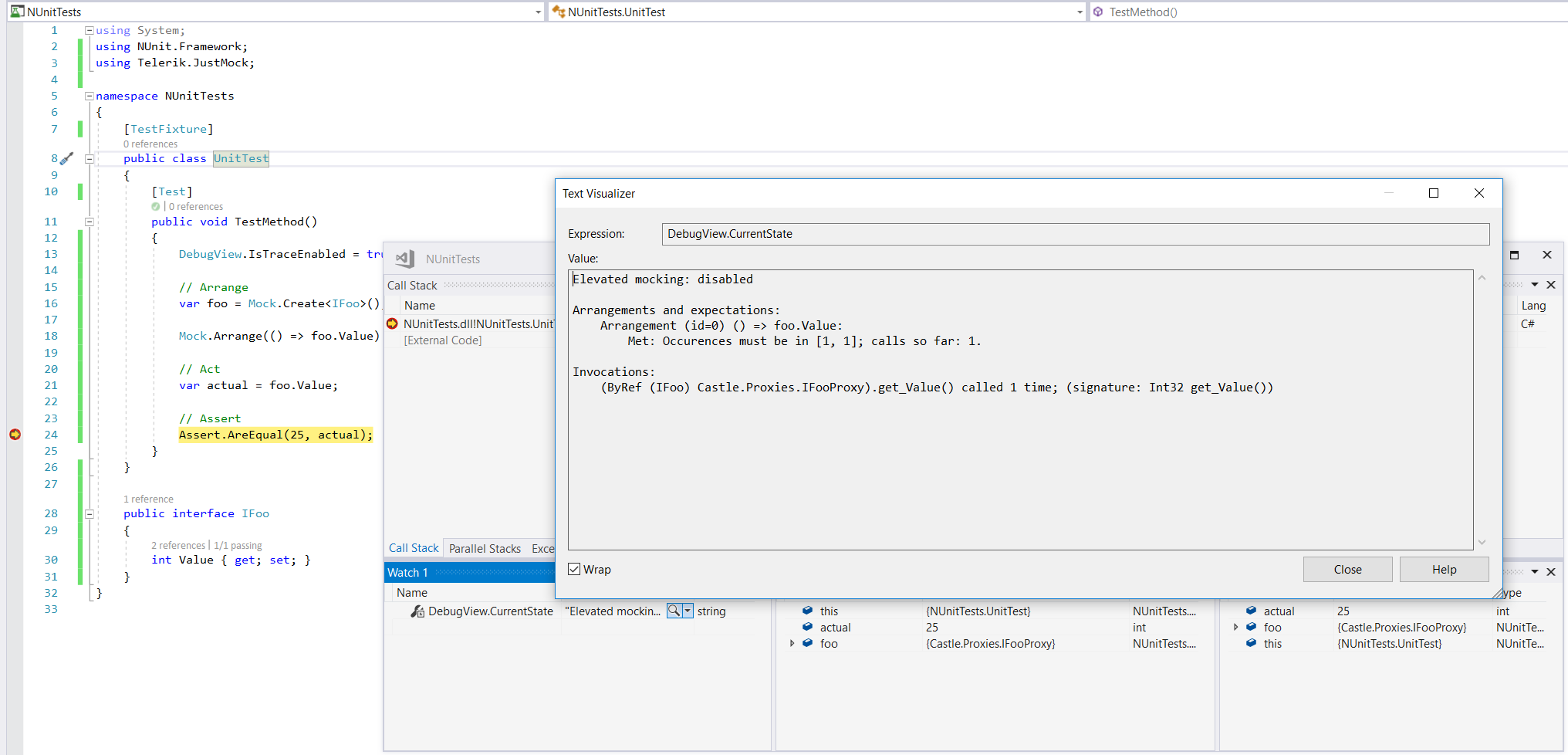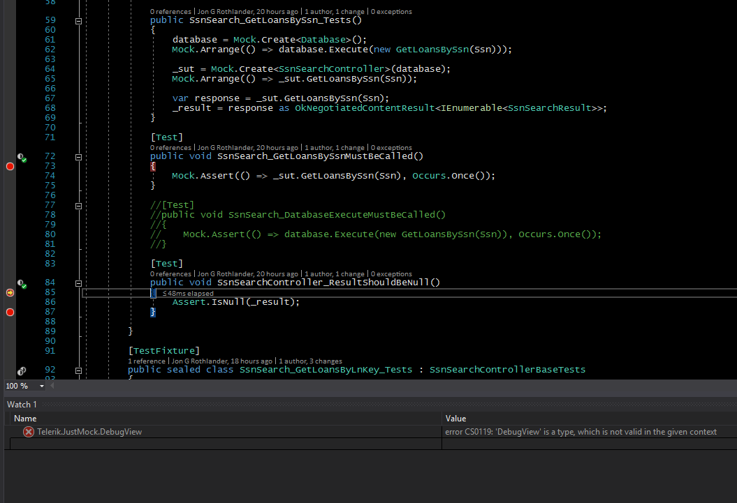 using System.Collections.Generic;using System.Diagnostics.CodeAnalysis;using System.Web.Http.Results;using DHI.Common.Data.Cqrs;using DHI.SSNSearch.API;using DHI.SSNSearch.Data.Access;using NUnit.Framework;using Telerik.JustMock;using Assert = NUnit.Framework.Assert;namespace DHI.SsnSearch.Testing.UnitTests{ [SuppressMessage("ReSharper", "InconsistentNaming")] [TestFixture] public class SsnSearchControllerUnitTests { private const string Ssn = "000-11-1111"; private const string LnKey = "001120210"; private static SsnSearchController _sut; private static IDatabase database; public class SsnSearchControllerBaseTests { [Test] public void SsnSearchController_ConstructorShouldNotErr() { Mock.Assert(_sut); } [Test] public void SsnSearchController_DatabaseExecuteCalledWithoutErring() { Mock.Assert(database); } } [TestFixture] public sealed class SsnSearchController_Constructor_Tests : SsnSearchControllerBaseTests { public SsnSearchController_Constructor_Tests() { var database = Mock.Create<Database>(); _sut = new SsnSearchController(database); Mock.Arrange(() => new SsnSearchController(database)); } } [TestFixture] public sealed class SsnSearch_GetLoansBySsn_Tests : SsnSearchControllerBaseTests { private readonly OkNegotiatedContentResult<IEnumerable<SsnSearchResult>> _result; public SsnSearch_GetLoansBySsn_Tests() { database = Mock.Create<Database>(); Mock.Arrange(() => database.Execute(new GetLoansBySsn(Ssn))); _sut = Mock.Create<SsnSearchController>(database); Mock.Arrange(() => _sut.GetLoansBySsn(Ssn)); var response = _sut.GetLoansBySsn(Ssn); _result = response as OkNegotiatedContentResult<IEnumerable<SsnSearchResult>>; } [Test] public void SsnSearch_GetLoansBySsnMustBeCalled() { Mock.Assert(() => _sut.GetLoansBySsn(Ssn), Occurs.Once()); } //[Test] //public void SsnSearch_DatabaseExecuteMustBeCalled() //{ // Mock.Assert(() => database.Execute(new GetLoansBySsn(Ssn)), Occurs.Once()); //} [Test] public void SsnSearchController_ResultShouldBeNull() { Assert.IsNull(_result); } } [TestFixture] public sealed class SsnSearch_GetLoansByLnKey_Tests : SsnSearchControllerBaseTests { private readonly OkNegotiatedContentResult<IEnumerable<SsnSearchResult>> _result; public SsnSearch_GetLoansByLnKey_Tests() { database = Mock.Create<Database>(); _sut = new SsnSearchController(database); Mock.Arrange(() => _sut.GetLoansByLnKey(LnKey)).IgnoreInstance().MustBeCalled(); Mock.Arrange(() => database.Execute(null)).IgnoreInstance().MustBeCalled(); var response = _sut.GetLoansByLnKey(LnKey); _result = response as OkNegotiatedContentResult<IEnumerable<SsnSearchResult>>; } [Test] public void SsnSearch_GetLoansByLnKey_ResultShouldBeNull() { Assert.IsNull(_result); } } }}This is indeed a very strange behavior because when you access a property of the DebugView it is shown as expected. This can be seen from the screenshot in my previous post where I have added DebugView.CurrentState to the Watch window.
