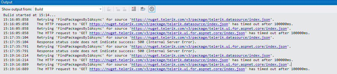 The HTTP request to 'GET https://nuget.telerik.com/v3/package/telerik.datasource/index.json' has timed out after 100000ms.