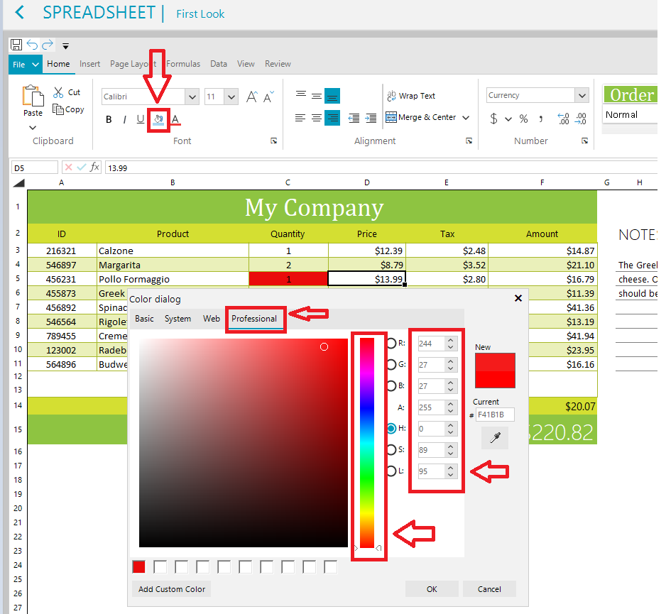 You can apply custom color to the cell by using the Color dialog from the Font buttons group. The Color dialog contains four tabs that allow you to choose different colors. The Professional tab gives you more freedom to set up your color. Check the following image.