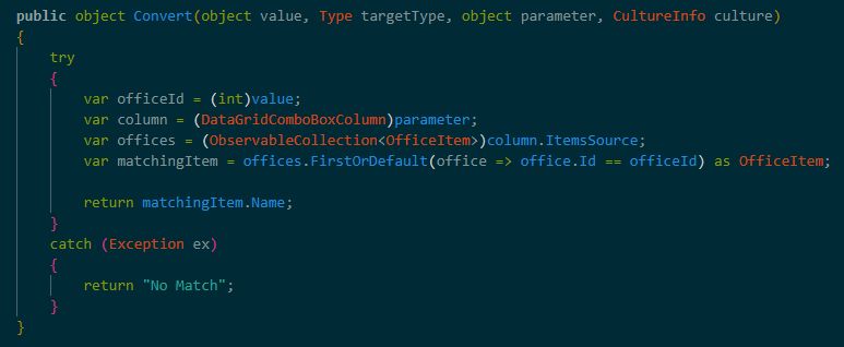 Finally, this is the converter's logic. As you can see, we used the column's reference to be able to access the Offices collection in an elegant manner. Then we search for any item that matches the foreign key ID and return that item's name: