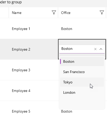 - The column's PropertyName is set to the 'Office' property of Employee object