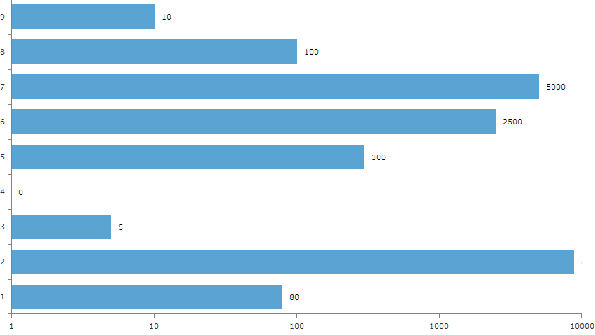 public MainPage() { InitializeComponent(); RadCartesianChart chart = new RadCartesianChart(); chart.VerticalAxis = new CategoricalAxis() ; chart.HorizontalAxis = new LogarithmicAxis() { LogarithmBase = 10 }; BarSeries bar = new BarSeries(); bar.ShowLabels = true; bar.DataPoints.Add(new CategoricalDataPoint() { Value = 80 }); bar.DataPoints.Add(new CategoricalDataPoint() { Value = 8800 }); bar.DataPoints.Add(new CategoricalDataPoint() { Value = 5 }); bar.DataPoints.Add(new CategoricalDataPoint() { Value = 0 }); bar.DataPoints.Add(new CategoricalDataPoint() { Value = 300 }); bar.DataPoints.Add(new CategoricalDataPoint() { Value = 2500 }); bar.DataPoints.Add(new CategoricalDataPoint() { Value = 5000 }); bar.DataPoints.Add(new CategoricalDataPoint() { Value = 100 }); bar.DataPoints.Add(new CategoricalDataPoint() { Value = 10 }); chart.Series.Add(bar); this.LayoutRoot.Children.Add(chart); }To summarize - I suggest that you switch to RadChartView your custom scenario and use it in any future charting projects if possible. Regards,