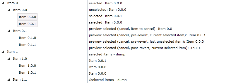 private void treeView_PreviewUnselected(object sender, Telerik.Windows.RadRoutedEventArgs e){ unselectedItem = e.Source as RadTreeViewItem; //this.ListBox1.Items.Add("preview unselected: " + GetDataItem(e.Source).Name); Debug.WriteLine("preview unselected: " + GetDataItem(e.Source).Name);}private void treeView_PreviewSelected( object sender, Telerik.Windows.RadRoutedEventArgs e ){ //this.ListBox1.Items.Add("preview selected--------------Begin"); Debug.WriteLine("preview selected--------------Begin"); RadTreeViewItem itemContainer = e.Source as RadTreeViewItem; if (itemContainer == null) { this.ListBox1.Items.Add("itemContainer == null"); } DataItem item = itemContainer.Item as DataItem; if (item == null) { this.ListBox1.Items.Add("item == null"); } if (!item.isSelectable) //if ( !( item.Item as DataItem ).isSelectable ) { e.Handled = true; //this.ListBox1.Items.Add("preview selected (cancel, item to cancel): " + GetDataItem(e.Source).Name); //this.ListBox1.Items.Add("preview selected (cancel, pre-revert, current selected item): " + GetDataItem(treeView.SelectedItem).Name); //this.ListBox1.Items.Add("preview selected (cancel, pre-revert, last unselected item): " + GetDataItem(unselectedItem).Name); Debug.WriteLine("preview selected (cancel, item to cancel): " + GetDataItem(e.Source).Name); Debug.WriteLine("preview selected (cancel, pre-revert, current selected item): " + GetDataItem(treeView.SelectedItem).Name); Debug.WriteLine("preview selected (cancel, pre-revert, last unselected item): " + GetDataItem(unselectedItem).Name); //treeView.SelectedItem = unselectedItem; //this.ListBox1.Items.Add("preview selected (cancel, post-revert, current selected item): " + (treeView.SelectedItem == null ? "<null>" : GetDataItem(treeView.SelectedItem).Name)); Debug.WriteLine("preview selected (cancel, post-revert, current selected item): " + (treeView.SelectedItem == null ? "<null>" : GetDataItem(treeView.SelectedItem).Name)); } else { //this.ListBox1.Items.Add("preview selected Selectable item: " + item.Name); Debug.WriteLine("preview selected Selectable item: " + item.Name); this.mustStop = false; } //this.ListBox1.Items.Add("preview selected--------------End"); Debug.WriteLine("preview selected--------------End");}void treeView_Unselected(object sender, Telerik.Windows.RadRoutedEventArgs e){ int i = 3; //this.ListBox1.Items.Add("unselected: " + GetDataItem(e.Source).Name); Debug.WriteLine("unselected: " + GetDataItem(e.Source).Name);}void treeView_Selected(object sender, Telerik.Windows.RadRoutedEventArgs e){ int i = 3; //this.ListBox1.Items.Add("selected: " + GetDataItem(e.Source).Name); Debug.WriteLine("selected: " + GetDataItem(e.Source).Name);}The code above produces the following output when "Item 0" is selected and you click on "Item 0.0":