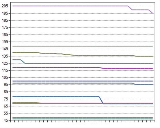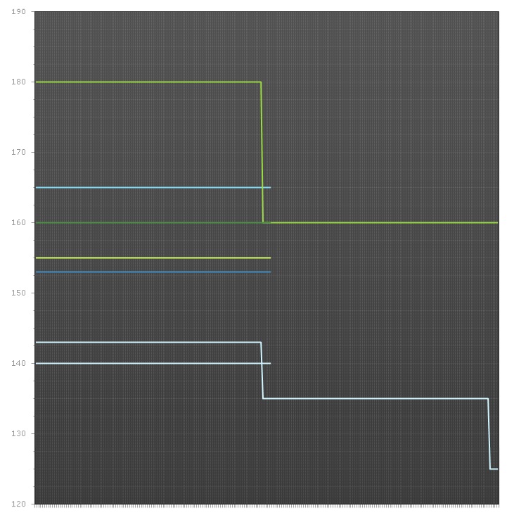 if (dt != null && dt.Rows.Count > 0){ //First approach STARTS RadChartBiddingLineGraph.DefaultType = Telerik.Charting.ChartSeriesType.Line; RadChartBiddingLineGraph.PlotArea.YAxis.AutoScale = false; RadChartBiddingLineGraph.PlotArea.YAxis.AddRange(Convert.ToInt32(dt.Rows[0][3]), Convert.ToInt32(dt.Rows[0][4]), 10); RadChartBiddingLineGraph.DataGroupColumn = "Hotel"; RadChartBiddingLineGraph.DataManager.ValuesYColumns = new String[] { "RateValue" }; RadChartBiddingLineGraph.DataSource = dt; RadChartBiddingLineGraph.DataBind(); foreach (Telerik.Charting.ChartSeries series in RadChartBiddingLineGraph.Series) { series.Appearance.LabelAppearance.Visible = false; RadChartBiddingLineGraph.PlotArea.XAxis.Appearance.LabelAppearance.Visible = false; } //First approach ENDS //Second approach STARTS DataTable dt2 = new DataTable(); // Get the distinct records. HERE dt1 is the table in which there are all records(which are retrieved from SP) dt2 = dt.DefaultView.ToTable(true, dt.Columns[0].ColumnName); int s = 0; RadChartBiddingLineGraph.PlotArea.YAxis.AutoScale = false; RadChartBiddingLineGraph.PlotArea.YAxis.AddRange(120, 185, 5); foreach (DataRow item in dt2.Rows) //dt2 is the datatable in if have now distinct AuctionInviteIDs { //just get the data on basis of AuctionInviteId //if want the result in datatable DataTable dtFilteredTable = (from a in dt.AsEnumerable() where a.Field<Int32>("AuctionInviteID").Equals(item["AuctionInviteID"]) select a).CopyToDataTable(); ChartSeries chartSeries = new ChartSeries(); chartSeries.Name = s.ToString(); RadChartBiddingLineGraph.AddChartSeries(chartSeries); chartSeries.Type = ChartSeriesType.Line; foreach (DataRow item2 in dtFilteredTable.Rows) { chartSeries.AddItem(Convert.ToInt32(item2["RateValue"])); //RadChartBiddingLineGraph.Series[s].AddItem(Convert.ToInt32(item2["RateValue"])); } RadChartBiddingLineGraph.Series.Add(chartSeries); s = s + 1; } RadChartBiddingLineGraph.DataGroupColumn = "Hotel"; RadChartBiddingLineGraph.DataSource = dt; RadChartBiddingLineGraph.DataBind(); foreach (Telerik.Charting.ChartSeries series in RadChartBiddingLineGraph.Series) { series.Appearance.LabelAppearance.Visible = false; RadChartBiddingLineGraph.PlotArea.XAxis.Appearance.LabelAppearance.Visible = false; } //Second approach ENDS}With first approach, i am getting the graph "Result.jpg" as in the attachment, which is not using the full length of x-axis for each series.