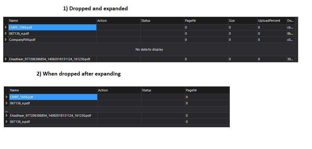 I am developing a application using VirtualGrid which is used to drag and drop files and list the properties of the files. All is working fine. But when i expanded a row and dragged a new file, the whole grid was distorted. Please see the attached image for details.