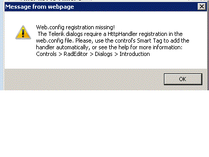 I am working with Rad WYSWYG editor here i can see editor i can type text make it bols ,align it etc but when i start adding link or making a text as hyperlink for that when i click on Isert Link Icon one widow gets pop by saying Web.config registration missing ! the telerik dialog require HttpHandler registration in web.config file. I am not getting wht this is happning i even added DialogHandlerUrl="~/Telerik.Web.UI.DialogHandler.axd" property but still not able to add link.