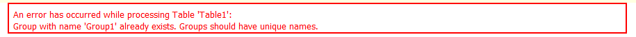 tableGroup112.Name = "Group2";Please keep in mind the report compiles successfully, but the error is returned during report generation. I found a quick fix was to delete each line (similar to above) for each table that wasn't rendering. Once I did that, everything is working fine.
