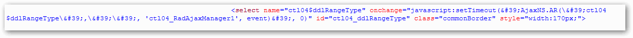 <select name="usercontrol:citydropdown" onchange="javascript:setTimeout('AjaxNS.AR(\'usercontrol:citydropdown\',\'\', 'RadAjaxManager1', event)', 0)" id="usercontrol_citydropdown"> </select>Excerpt from a ASP.NET Breaking Changes in 4