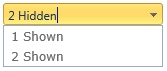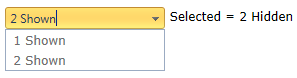 <telerik:RadComboBox ID="RadComboBox1" runat="server"> <Items> <telerik:RadComboBoxItem runat="server" Text="1 Shown" /> <telerik:RadComboBoxItem runat="server" Text="2 Hidden" /> <telerik:RadComboBoxItem runat="server" Text="2 Shown" /> </Items></telerik:RadComboBox>JavaScript: