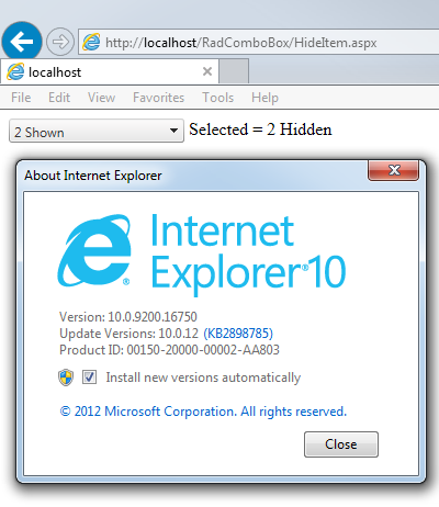 01.<script type="text/javascript">02. function pageLoad()03. {04. var item = $find("<%=RadComboBox1.ClientID%>").get_items().getItem(1);05. item.get_element().style.display = 'none';06. item.disable();07. }08. 09. function onComboChanged(sender, args)10. {11. alert('OnComboChanged, SelectedValue = ' + $find("<%=RadComboBox1.ClientID%>").get_selectedItem().get_value());12. }13. 14. function onBtnClicked(sender, args)15. {16. alert('SelectedValue = ' + $find("<%=RadComboBox1.ClientID%>").get_selectedItem().get_value());17. }18.</script>19.<telerik:RadComboBox ID="RadComboBox1" runat="server" OnClientSelectedIndexChanged="onComboChanged">20.<Items>21. <telerik:RadComboBoxItem runat="server" Text="1 Shown" Value="1 Shown" />22. <telerik:RadComboBoxItem runat="server" Text="2 Shown" Value="2 Hidden" />23. <telerik:RadComboBoxItem runat="server" Text="2 Shown" Value="2 Shown" />24.</Items>25.</telerik:RadComboBox>26.<telerik:RadButton ID="RadTextButton1" runat="server" AutoPostBack="false" OnClientClicked="onBtnClicked" /> I load the page, press "TAB" to focus the combo box, press "2" to select the item, and press one more "TAB" to leave the combo box. The correct combobox item is selected in the combo box, but OnClientSelectedIndexChanged event is not raised. Moreover, if then I click the button next to the combo box, it displays "SelectedValue = 1 Shown" instead of expected "SelectedValue = 2 Shown".