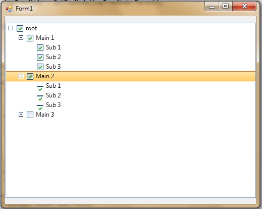 using System.Data; using System.Drawing; using System.Linq; using System.Text; using System.Windows.Forms; using Telerik.WinControls.UI; namespace TreeViewTest { public partial class Form1 : Form { private System.ComponentModel.IContainer components; /// <summary> /// Clean up any resources being used. /// </summary> /// <param name="disposing">true if managed resources should be disposed; otherwise, false.</param> protected override void Dispose(bool disposing) { if (disposing && (components != null)) { components.Dispose(); } base.Dispose(disposing); } private Telerik.WinControls.UI.RadTreeView radTreeView1; private void InitializeComponent() { this.radTreeView1 = new Telerik.WinControls.UI.RadTreeView(); ((System.ComponentModel.ISupportInitialize)(this.radTreeView1)).BeginInit(); this.SuspendLayout(); // // radTreeView1 // this.radTreeView1.Location = new System.Drawing.Point(1, 13); this.radTreeView1.Name = "radTreeView1"; this.radTreeView1.Size = new System.Drawing.Size(496, 347); this.radTreeView1.SpacingBetweenNodes = -1; this.radTreeView1.TabIndex = 0; this.radTreeView1.Text = "radTreeView1"; this.radTreeView1.NodeCheckedChanged += new Telerik.WinControls.UI.RadTreeView.TreeViewEventHandler(this.radTreeView1_NodeCheckedChanged); // // Form1 // this.AutoScaleDimensions = new System.Drawing.SizeF(6F, 13F); this.AutoScaleMode = System.Windows.Forms.AutoScaleMode.Font; this.ClientSize = new System.Drawing.Size(497, 372); this.Controls.Add(this.radTreeView1); this.Name = "Form1"; this.Text = "Form1"; this.Load += new System.EventHandler(this.Form1_Load); ((System.ComponentModel.ISupportInitialize)(this.radTreeView1)).EndInit(); this.ResumeLayout(false); } public Form1() { InitializeComponent(); } private void radTreeView1_NodeCheckedChanged(object sender, Telerik.WinControls.UI.RadTreeViewEventArgs e) { this.radTreeView1.NodeCheckedChanged -= radTreeView1_NodeCheckedChanged; if (e.Node.Nodes.Count > 0) { this.CheckAllChildNodes(e.Node, e.Node.Checked); } e.Node.Expanded = true; RadTreeNode topNode = GetTopNode(e.Node); CheckAllChildNodesForChecked(topNode); this.radTreeView1.NodeCheckedChanged += new RadTreeView.TreeViewEventHandler(radTreeView1_NodeCheckedChanged); } private void CheckAllChildNodes(RadTreeNode treeNode, bool nodeChecked) { foreach (RadTreeNode node in treeNode.Nodes) { node.Checked = nodeChecked; if (node.Nodes.Count > 0) { this.CheckAllChildNodes(node, nodeChecked); } } } private bool CheckAllChildNodesForChecked(RadTreeNode treeNode) { bool childChecked = false; foreach (RadTreeNode node in treeNode.Nodes) { if (node.Nodes.Count > 0) { if (this.CheckAllChildNodesForChecked(node)) { childChecked = true; } } else { if (!childChecked) { childChecked = node.Checked; } } } if (childChecked) { treeNode.Checked = true; } else { treeNode.Checked = false; } return childChecked; } private RadTreeNode GetTopNode(RadTreeNode treeNode) { RadTreeNode topTreeNode = treeNode; if (topTreeNode.Parent != null) { topTreeNode = GetTopNode(topTreeNode.Parent); } return topTreeNode; } private void Form1_Load(object sender, EventArgs e) { radTreeView1.Nodes.Clear(); RadTreeNode root = new RadTreeNode("root"); root.CheckType = CheckType.CheckBox; for (int x = 1; x < 4; x++) { RadTreeNode main = new RadTreeNode("Main " + x.ToString()); main.CheckType = CheckType.CheckBox; for (int y = 1; y < 4; y++) { RadTreeNode sub = new RadTreeNode("Sub " + y.ToString()); sub.CheckType = CheckType.CheckBox; main.Nodes.Add(sub); } main.Expanded = false; root.Nodes.Add(main); } root.Expanded = true; radTreeView1.Nodes.Add(root); } } }