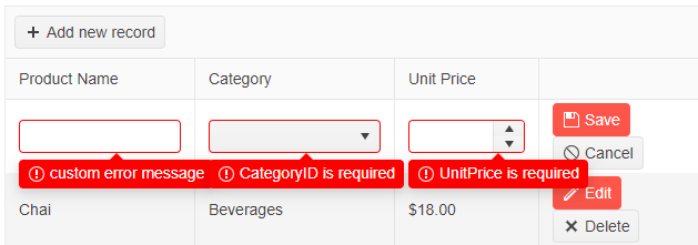 Could you please assist me in resolving this issue? I would like the custom validation error message for the "Category" column to be displayed when validation fails, similar to the "ProductName" column.