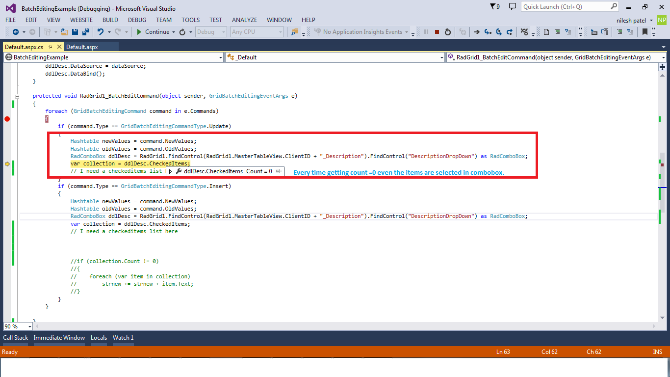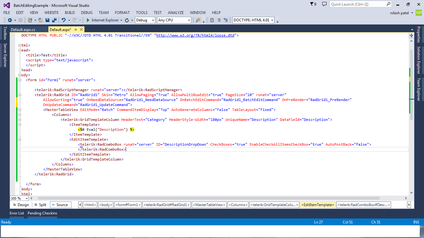 I am using a Telerik radGrid with batch editing functionality. I have a one grid inside of this grid have a one RadComboBox with multiselect option.