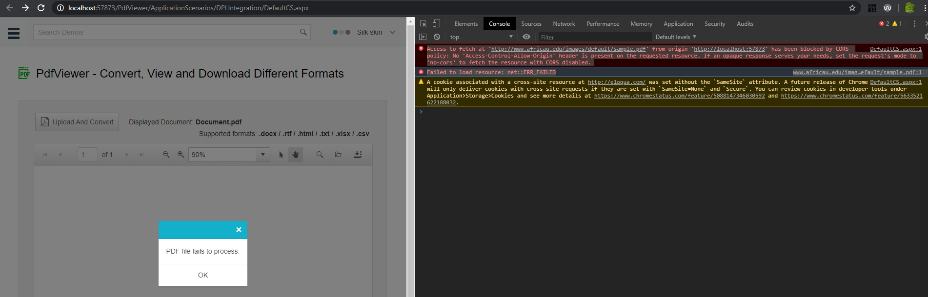 Access to fetch at 'http://www.africau.edu/images/default/sample.pdf' from origin 'http://localhost:57873' has been blocked by CORS policy: No 'Access-Control-Allow-Origin' header is present on the requested resource. If an opaque response serves your needs, set the request's mode to 'no-cors' to fetch the resource with CORS disabled.