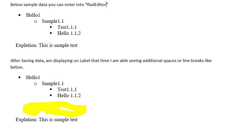 Thanks. After adding above mentioned property it's working for me. Now, as per my requirement, Edit mode I am using "Rad Editor" and displaying purpose I am using Label. What ever data I enter into RadEditor and click on "Save" data displaying on label with additional line breaks or spaces.