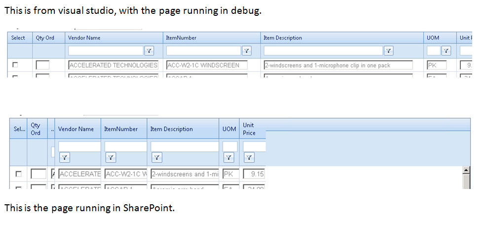 I had the spacing of grids and columns working in visual studio, in debug, but then I put this page in Sharepoint as a Web Part, using the Sharepoint Page Viewer, the columns are all shrunk and my settings for the HeaderStyle-Width and FilterControlWidth are not working.