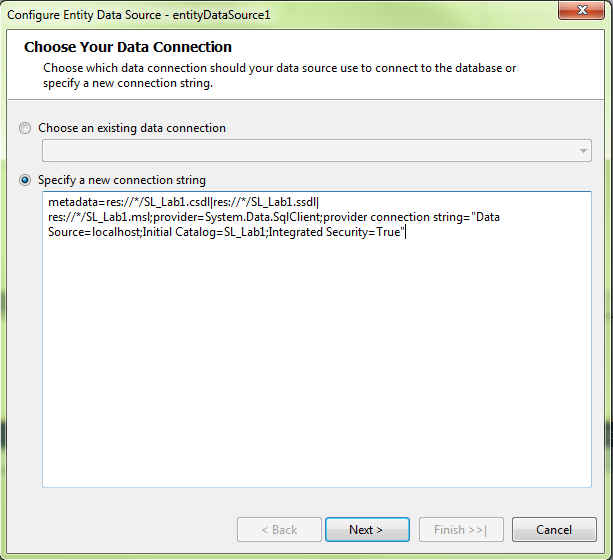 entityDataSource.ConnectionString = "SL_Lab1Entites";7) Change ConnectionString to: