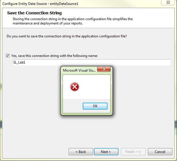 b) Proceed to the "Save the Connection String" page, leaving the "Yes, save this connection string..." checkbox checked, I click "Next" and receive a "blank" VS2010 error. (See attachment "SaveError")