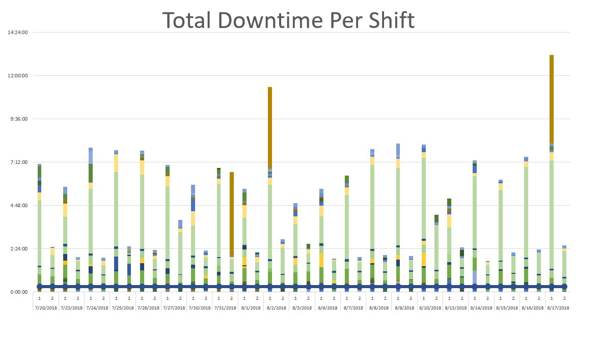 I should have a bar for shift 1 on Date 9-6, shift 2 on Date 9-6, shift 1 on Date 9-7 and shift 2 on Date 9-7. Each of the four bars would have 2 reasons grouped together on each bar. I have attached a jpeg of what I am ultimately trying to replace.