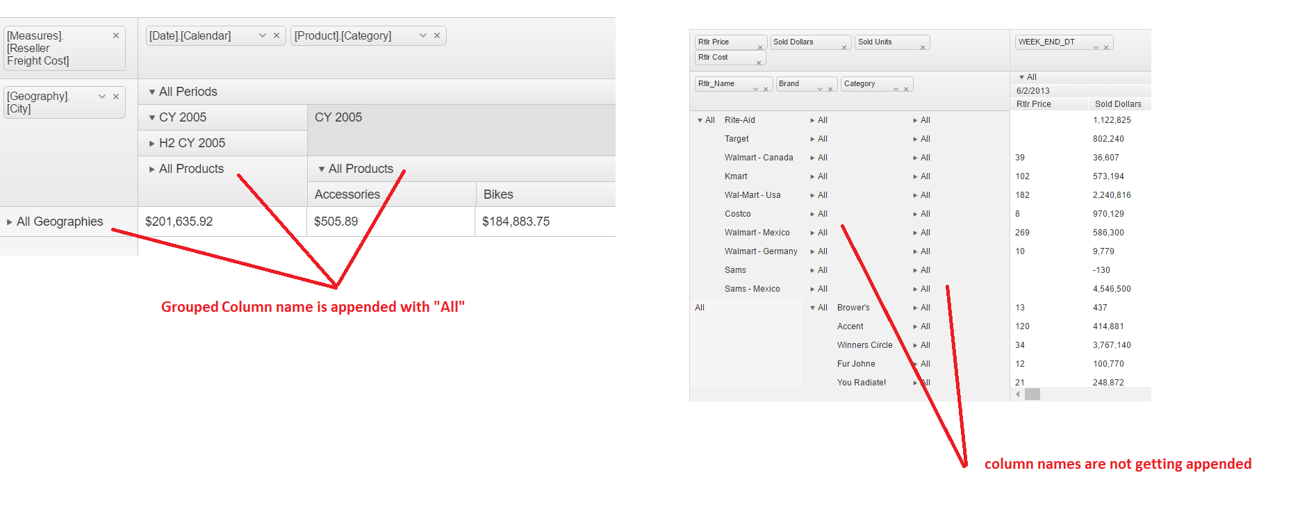 The main issue which we are facing now is : we want to change the GroupHeaders/RowHeaders. In the demo Pivot grid from Telerik website, I can notice the Group headers like "All Geographies", "All Products" etc. But in the grid which we have generated we are getting the headers as "All". We would like to include the values like "All Brand", "All Category" instead of "All". Please refer the snapshot attached for more info.