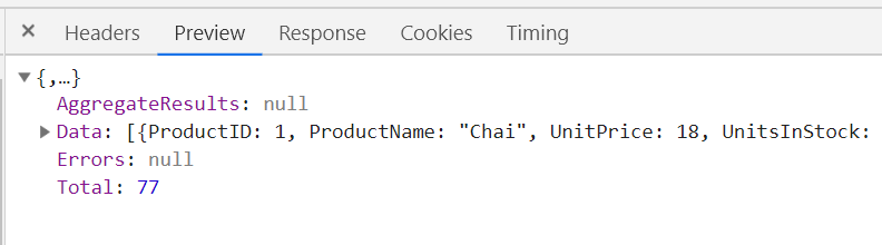public ActionResult Read([DataSourceRequest] DataSourceRequest request){ DataTable products = Products(); if (request.Aggregates.Any()) { request.Aggregates.Each(agg => { agg.Aggregates.Each(a => { a.MemberType = products.Columns[agg.Member].DataType; }); }); } return Json(products.ToDataSourceResult(request));}