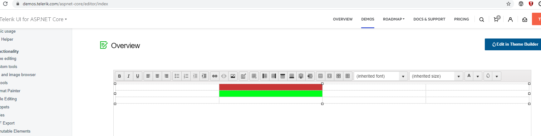 I'm interested in using the Editor control in a new project, but I'm concerned with the functionality in the Demo (https://demos.telerik.com/aspnet-core/editor/index). For example, how do I change the properties of a cell in a table? If I put my karat in the cell then click the Table Wizard button, I can choose a background color but it creates a whole new table within the cell -- but what I want is to modify the selected cell.