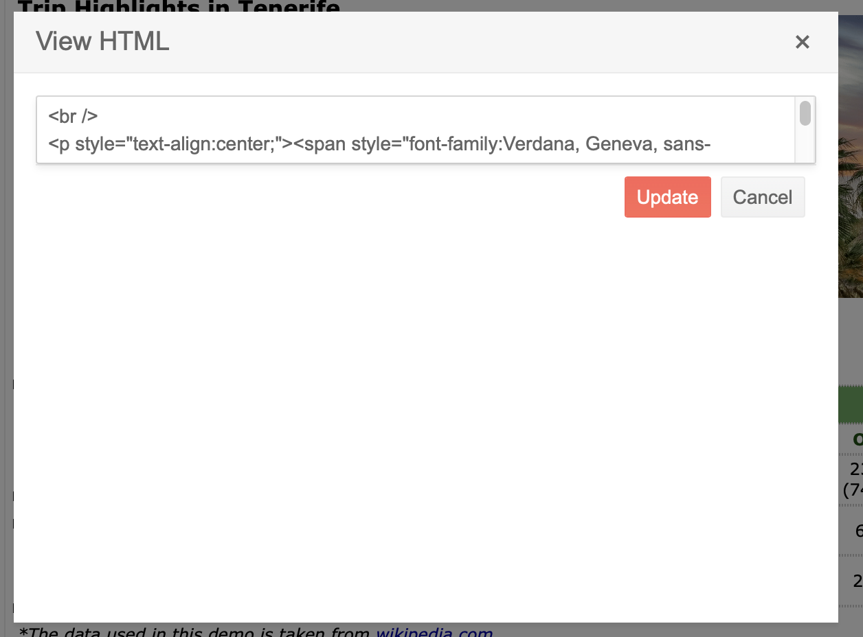 If I click the "View HTML" button then a dialog is displayed, but the text area for the HTML code is only two lines tall. I'm unable to resize the control.