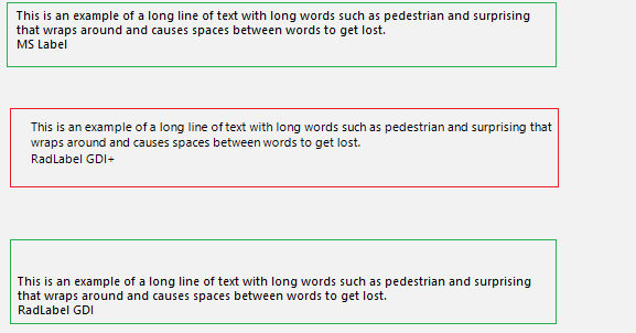 this.radLabel3.UseCompatibleTextRendering = false;That is why in this case the MS Label (the first one at the top) and the bottom RadLabel with HTML-like text offer different text rendering: