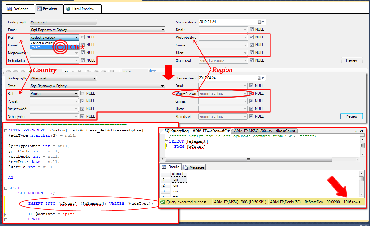 public class AdrAddressesCache{ public string adrElement { get; set; } public string parameters { get; set; } public List<AddressElement> CachedList { get; set; }}public class AdrAddresses{ private static List<AdrAddressesCache> CacheAddresses = new List<AdrAddressesCache>(); private static int counter = 0; public List<AddressElement> GetAdrAddresses(string adrType, string adrElement, string adrCountry, string adrRegion, string adrPlace, string adrCommunity, string adrCity, string adrStreet, Nullable<int> proTypeOwner, Nullable<int> proConId, Nullable<int> proDepId, Nullable<DateTime> proDate, Nullable<int> userId) { string element = adrType + adrElement; string parameters = adrCountry + adrRegion + adrPlace + adrCommunity + adrCity + adrStreet + proTypeOwner.ToString() + proConId.ToString() + proDepId.ToString() + proDate.ToString() + userId.ToString(); if (CacheAddresses.Where(x => x.adrElement == element).Count() > 0) { if (CacheAddresses.Where(x => x.adrElement == element && x.parameters == parameters).Count() > 0) { return CacheAddresses.Where(x => x.adrElement == element && x.parameters == parameters).FirstOrDefault().CachedList; } } else { CacheAddresses.Add(new AdrAddressesCache() { adrElement = element }); } using (SqlConnection cn = new SqlConnection(ConfigurationManager.ConnectionStrings["ConnectionMainDataBase"].ConnectionString)) { counter++; Debug.WriteLine("EXECUTE Addresses: " + adrElement + "[" + counter + "]"); SqlCommand cmd = new SqlCommand("Custom.adrAddress_GetAddressesElementByUse", cn); cmd.CommandType = CommandType.StoredProcedure; if (!String.IsNullOrEmpty(adrType)) cmd.Parameters.Add("@adrType", SqlDbType.NVarChar).Value = adrType; cmd.Parameters.Add("@adrElement", SqlDbType.NVarChar).Value = adrElement; if (!String.IsNullOrWhiteSpace(adrCountry)) cmd.Parameters.Add("@adrCountry", SqlDbType.NVarChar).Value = adrCountry; if (!String.IsNullOrWhiteSpace(adrRegion)) cmd.Parameters.Add("@adrRegion", SqlDbType.NVarChar).Value = adrRegion; if (!String.IsNullOrWhiteSpace(adrPlace)) cmd.Parameters.Add("@adrPlace", SqlDbType.NVarChar).Value = adrPlace; if (!String.IsNullOrWhiteSpace(adrCommunity)) cmd.Parameters.Add("@adrCommunity", SqlDbType.NVarChar).Value = adrCommunity; if (!String.IsNullOrWhiteSpace(adrCity)) cmd.Parameters.Add("@adrCity", SqlDbType.NVarChar).Value = adrCity; if (!String.IsNullOrWhiteSpace(adrStreet)) cmd.Parameters.Add("@adrStreet", SqlDbType.NVarChar).Value = adrStreet; if (proTypeOwner.HasValue && proTypeOwner.Value > 0) cmd.Parameters.Add("@proTypeOwner", SqlDbType.Int).Value = proTypeOwner.Value; if (proConId.HasValue && proConId.Value > 0) cmd.Parameters.Add("@proConId", SqlDbType.Int).Value = proConId.Value; if (proDepId.HasValue && proDepId.Value > 0) cmd.Parameters.Add("@proDepId", SqlDbType.Int).Value = proDepId.Value; if (proDate.HasValue && proDate.Value > DateTime.MinValue) cmd.Parameters.Add("@proDate", SqlDbType.Date).Value = proDate.Value.Date; if (userId.HasValue && userId.Value > 0) cmd.Parameters.Add("@userId", SqlDbType.Int).Value = userId.Value; cn.Open(); IDataReader reader = cmd.ExecuteReader(CommandBehavior.Default); List<AddressElement> AddressElements = new List<AddressElement>(); while (reader.Read()) { if (reader.FieldCount > 0) { AddressElement adr = new AddressElement() { adrElement = reader["adrElement"].ToString() }; AddressElements.Add(adr); } } CacheAddresses.Where(x => x.adrElement == element).FirstOrDefault().parameters = parameters; CacheAddresses.Where(x => x.adrElement == element).FirstOrDefault().CachedList = AddressElements; return AddressElements; } }}In the attachmented file you will see result.