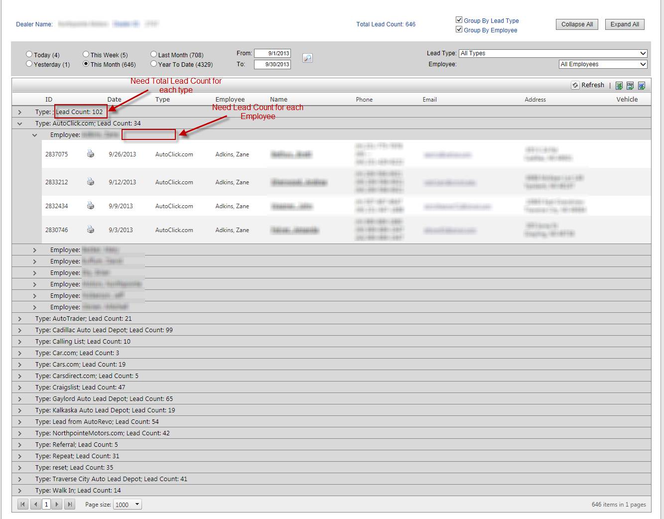 <telerik:RadGrid ID="rgLeads" ShowGroupPanel="false" AutoGenerateColumns="false" AllowSorting="true" ShowFooter="False" runat="server" GridLines="None" AllowPaging="true" PageSize="15" Width="100%" > <MasterTableView DataSourceID="sqldsLeads" ShowGroupFooter="false" CommandItemDisplay="Top" EditMode="InPlace" PagerStyle-PageSizes="15,25,50,100,250,500,1000"> <PagerStyle AlwaysVisible="true"/> <CommandItemSettings ShowExportToExcelButton="true" ShowExportToCsvButton="true" ShowExportToWordButton="true" ShowAddNewRecordButton="false"> </CommandItemSettings> <%--<GroupHeaderTemplate> <asp:Label runat="server" ID="Label3" style="font-weight:bold" Text='<%# Eval("LeadType")%>' ></asp:Label> <asp:Label runat="server" ID="Label1" style="font-weight:bold" Text='<%# "(" + Eval("TotalCount").ToString() + " Total)" %>' ></asp:Label> </GroupHeaderTemplate>--%> <Columns> <telerik:GridTemplateColumn HeaderText="ID"> <ItemTemplate> <asp:label runat="server" ID="lblTicketID" Text='<%# Eval("UpTicketID") %>' ></asp:label> </ItemTemplate> </telerik:GridTemplateColumn> <telerik:GridTemplateColumn> <ItemTemplate> <asp:ImageButton runat="server" ID="imgbtnPrint" ImageUrl="images/print_16.gif" OnClick="imgbtnPrint_click" ToolTip="Print lead datasheet." /> </ItemTemplate> </telerik:GridTemplateColumn> <telerik:GridTemplateColumn HeaderText="Date" SortExpression="CreatedTDS"> <ItemTemplate> <asp:label runat="server" ID="lblDate" Text='<%# Format(Eval("CreatedTDS"),"M/d/yyyy") %>' ToolTip='<%# Format(Eval("CreatedTDS"),"t") %>' ></asp:label> </ItemTemplate> </telerik:GridTemplateColumn> <telerik:GridBoundColumn DataField="LeadType" HeaderText="Type" SortExpression="LeadType" Aggregate="Count" > </telerik:GridBoundColumn> <telerik:GridBoundColumn DataField="EmployeeName" HeaderText="Employee" SortExpression="EmployeeName" > </telerik:GridBoundColumn> <telerik:GridTemplateColumn HeaderText="Name" SortExpression="Lname"> <ItemTemplate> <asp:HyperLink runat="server" ID="hlClientHistory" NavigateUrl='<%# "ClientHistory2.aspx?clientID=" + CStr(Eval("ClientID"))%>' Text='<%# Eval("ClientName") %>' Target="_blank" ></asp:HyperLink> </ItemTemplate> </telerik:GridTemplateColumn> <telerik:GridTemplateColumn HeaderText="Phone"> <ItemTemplate> <asp:label runat="server" ID="lblPhone" ></asp:label> </ItemTemplate> <ItemStyle Width="120px" /> </telerik:GridTemplateColumn> <telerik:GridTemplateColumn HeaderText="Email"> <ItemTemplate> <a href='mailto:<%# Eval("EmailAddress") %>' style="font-family: Segoe UI, Arial, Verdana; font-size: 11px; color: #777697;"><%# Eval("EmailAddress") %></a> </ItemTemplate> </telerik:GridTemplateColumn> <telerik:GridTemplateColumn HeaderText="Address"> <ItemTemplate> <asp:label runat="server" ID="lblAddress" ></asp:label> </ItemTemplate> </telerik:GridTemplateColumn> <telerik:GridTemplateColumn HeaderText="Vehicle" SortExpression="Manufacturer"> <ItemTemplate> <asp:label runat="server" ID="lblVehicle" Text='<%# Eval("Vehicle") %>' ></asp:label> <asp:LinkButton runat="server" ID="lbShowVehicle" OnClick="lbShowVehicle_click" Text='<%# Eval("Vehicle") %>' style="font-family: Segoe UI, Arial, Verdana; font-size: 11px; color: #777697;"></asp:LinkButton> </ItemTemplate> </telerik:GridTemplateColumn> </Columns> <GroupByExpressions> <telerik:GridGroupByExpression> <GroupByFields> <telerik:GridGroupByField FieldName="LeadType" FieldAlias="LeadType" > </telerik:GridGroupByField> </GroupByFields> <SelectFields> <telerik:GridGroupByField FieldName="LeadType" FieldAlias="LeadType" HeaderText="Lead Type" > </telerik:GridGroupByField> <%--<telerik:GridGroupByField FieldName="UpTicketID" FieldAlias="TicketCount" Aggregate="Count" > </telerik:GridGroupByField>--%> </SelectFields> </telerik:GridGroupByExpression> <telerik:GridGroupByExpression> <GroupByFields> <telerik:GridGroupByField FieldName="EmployeeName" FieldAlias="EmployeeName" > </telerik:GridGroupByField> </GroupByFields> <SelectFields> <telerik:GridGroupByField FieldName="EmployeeName" FieldAlias="EmployeeName" HeaderText="Employee" > </telerik:GridGroupByField> <%--<telerik:GridGroupByField FieldName="UpTicketID" FieldAlias="TicketCount" Aggregate="Count" > </telerik:GridGroupByField>--%> </SelectFields> </telerik:GridGroupByExpression> </GroupByExpressions> </MasterTableView> <ExportSettings ExportOnlyData="true" IgnorePaging="true"> <Excel Format="Biff"></Excel> </ExportSettings> <ClientSettings AllowDragToGroup="true"> </ClientSettings> <GroupingSettings ShowUnGroupButton="true" ></GroupingSettings></telerik:RadGrid>