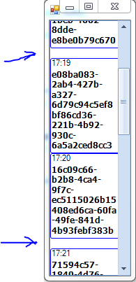 public partial class Form1 : Form { private BindingList<TraceMessage> _messages; public Form1() { InitializeComponent(); this.radListView1.Dock = DockStyle.Fill; radListView1.ViewType = ListViewType.IconsView;//TODO: was ListViewType.ListView this.radListView1.AllowArbitraryItemHeight = true; _messages = new BindingList<TraceMessage>(); for (int i = 0; i < 10; i++) { _messages.Add(new TraceMessage() { MessageText = Guid.NewGuid().ToString() + " " + Guid.NewGuid().ToString(), Type = MessageTypes.Information, TimeStamp = DateTime.Now.AddMinutes(i).ToShortTimeString() }); } radListView1.DataSource = _messages; radListView1.DisplayMember = "MessageText"; radListView1.SizeChanged += new EventHandler(radListView1_SizeChanged); radListView1.HorizontalScrollState = ScrollState.AlwaysHide; radListView1.VisualItemCreating += new ListViewVisualItemCreatingEventHandler(radListView1_VisualItemCreating); } void radListView1_VisualItemCreating(object sender, ListViewVisualItemCreatingEventArgs e) { e.VisualItem = new TracerListElement(); } protected override void OnShown(EventArgs e) { base.OnShown(e); radListView1.ItemSize = new Size(this.radListView1.Width - this.radListView1.ListViewElement.ViewElement.VScrollBar.Size.Width, 0); } void radListView1_SizeChanged(object sender, EventArgs e) { radListView1.ItemSize = new Size(this.radListView1.Width - this.radListView1.ListViewElement.ViewElement.VScrollBar.Size.Width, 0); } private void radListView1_VisualItemFormatting(object sender, Telerik.WinControls.UI.ListViewVisualItemEventArgs e) { e.VisualItem.TextWrap = true; } } public enum MessageTypes { Warning, Error, Information } public class TraceMessage { public MessageTypes Type { get; set; } public string MessageText { get; set; } public string TimeStamp { get; set; } } class TracerListElement : IconListViewVisualItem//TODO: was SimpleListViewVisualItem { private Color _warningColor = Color.Blue; private Color _errorColor = Color.Red; private Color _regularColor = Color.Black; private Color _timeStampColor = Color.Black; private readonly Font _warningFont = new Font("Tahoma", 9, FontStyle.Bold, GraphicsUnit.Point); private readonly Font _errorFont = new Font("Tahoma", 9, FontStyle.Bold, GraphicsUnit.Point); private readonly Font _regularFont = new Font("Tahoma", 9, FontStyle.Bold, GraphicsUnit.Point); private LightVisualElement _timeStamp; private LightVisualElement _messageText; private WrapLayoutPanel _stackLayout; public TracerListElement() { BorderBoxStyle = BorderBoxStyle.FourBorders; BorderBottomWidth = 1; BorderLeftWidth = BorderRightWidth = BorderTopWidth = 0; BorderColor = Color.Blue; BorderGradientStyle = GradientStyles.Solid; DrawBorder = true; GradientStyle = GradientStyles.Solid; } protected override void CreateChildElements() { base.CreateChildElements(); _stackLayout = new WrapLayoutPanel { Orientation = Orientation.Horizontal }; _timeStamp = new LightVisualElement(); _timeStamp.TextAlignment = ContentAlignment.TopLeft; _messageText = new LightVisualElement(); _messageText.TextWrap = true; _messageText.TextAlignment = ContentAlignment.TopLeft; _stackLayout.Children.Add(_timeStamp); _stackLayout.Children.Add(_messageText); Children.Add(_stackLayout); } protected override void SynchronizeProperties() { var msg = (TraceMessage)Data.DataBoundItem; _timeStamp.Text = msg.TimeStamp; _timeStamp.ForeColor = _timeStampColor; _stackLayout.AutoSize = true; _stackLayout.AutoSizeMode = RadAutoSizeMode.Auto; _messageText.AutoSize = true; _messageText.AutoSizeMode = RadAutoSizeMode.Auto; switch (msg.Type) { case MessageTypes.Information: _messageText.ForeColor = _regularColor; _messageText.Font = _regularFont; break; case MessageTypes.Warning: _messageText.ForeColor = _warningColor; _messageText.Font = _warningFont; break; case MessageTypes.Error: _messageText.ForeColor = _errorColor; _messageText.Font = _errorFont; break; } _messageText.Text = msg.MessageText; _messageText.TextWrap = true; } protected override Type ThemeEffectiveType { get { return typeof(IconListViewVisualItem);//TODO: was SimpleListViewVisualItem } } }Just to clarify my post - I got similar issue to what Artem has described previously, I took the example, mentioned here and reviewed it a bit.