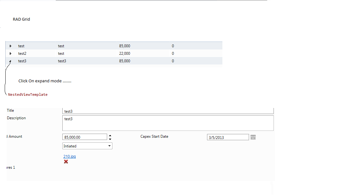 Protected Sub gridNodes_NeedDataSource(ByVal sender As Object, ByVal e As GridNeedDataSourceEventArgs) _ Handles gridNodes.NeedDataSource Me.gridNodes.DataSource = Me.ConsumptionContextViewModel.GetNodeWithParents() End SubProtected Sub gridNodes_DataBound(ByVal sender As Object, ByVal e As EventArgs) _ Handles gridNodes.DataBound If (gridNodes.Items.Count > 0) Then gridNodes.Items(0).Expanded = True End IfEnd SubProtected Sub gridNode_ItemCreated(ByVal sender As Object, ByVal e As GridItemEventArgs) _ Handles gridNodes.ItemCreated If (TypeOf (e.Item) Is GridNestedViewItem) Then Dim typeContent = DirectCast(e.Item.FindControl("gridStatements"), RadGrid) AddHandler typeContent.NeedDataSource, AddressOf Me.gridStatements_NeedDataSource AddHandler typeContent.ItemCommand, AddressOf Me.gridStatements_ItemCommand End IfEnd SubProtected Sub gridStatements_NeedDataSource(ByVal sender As Object, ByVal e As GridNeedDataSourceEventArgs) Dim grid = DirectCast(sender, RadGrid) Dim nodeId = DirectCast(grid.NamingContainer, GridNestedViewItem).ParentItem.GetDataKeyValue("NodeId") grid.DataSource = Me.ConsumptionContextViewModel.GetTextsForNode(CInt(nodeId)) End SubProtected Sub gridNode_ItemCommand(ByVal sender As Object, ByVal e As GridCommandEventArgs) _ Handles gridNodes.ItemCommand Select Case e.CommandName Case RadGrid.ExpandCollapseCommandName If (Not TypeOf (e.Item) Is GridDataItem) Then Return End If ' close all items except current. e.Item.Expanded will be expanded after leaving ItemCommand method For Each item As GridItem In gridNodes.MasterTableView.Items If item.Expanded AndAlso item IsNot e.Item Then item.Expanded = False End If Next ' select expanded row e.Item.FireCommandEvent(RadGrid.SelectCommandName, e) ' explicitly rebind inner container If (e.Item.Expanded = False) Then Dim dataItem = DirectCast(e.Item, GridDataItem) Dim innerContainer = DirectCast(dataItem.ChildItem.FindControl("gridStatements"), RadGrid) innerContainer.Rebind() End If Case "RowClick" ' manually fire expand event e.Item.FireCommandEvent(RadGrid.ExpandCollapseCommandName, New GridExpandCommandEventArgs(e.Item, sender, e)) Case Else ' do nothing End SelectEnd SubRegards,