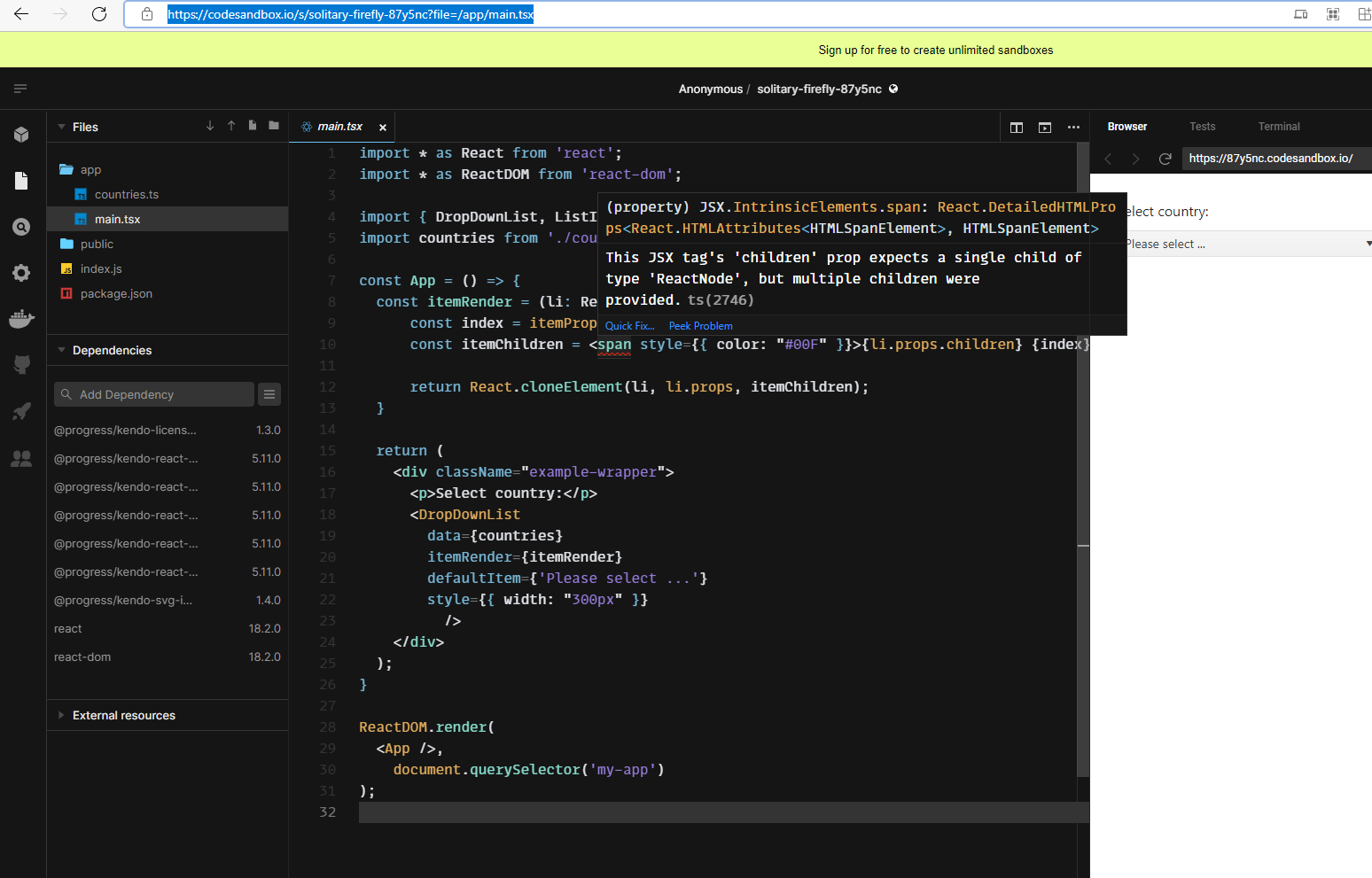 I'm trying the example (DropDownList, itemRender) here: https://www.telerik.com/kendo-react-ui/components/dropdowns/dropdownlist/custom-rendering/ but using last react version (18.2.0) the code give an error: