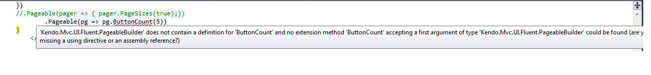 Thanks for quick response. Below is my code. I am already using ' .Pageable(pager => { pager.PageSizes(true);})' in my code. I have tried to use button count. But, it is showing error. I am attaching screenshot of error. Immediate help will be appreciated.