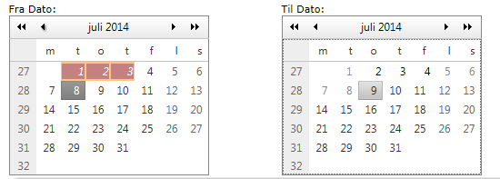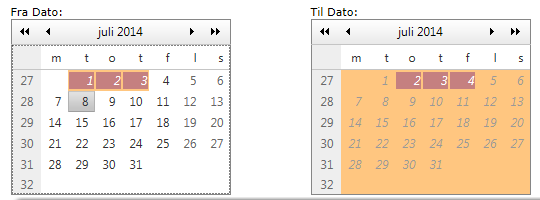 <style> .booked { background-color: darkred; color: white; font-style: italic; } .blocked { background-color: darkorange; color: white; font-style: italic; }</style><div style="float: left; width: 50%;"> Fra Dato:<telerik:RadCalendar ID="FromDate" RangeMinDate="<%# DateTime.Today %>" OnDayRender="Calendar_DayRender" runat="server" SelectedDate="<%# DateTime.Today %>" Enabled="False" EnableAriaSupport="True" EnableShadows="True" AutoPostBack="True" EnableMultiSelect="False" OnSelectionChanged="RadCalendar_SelectionChanged" ShowOtherMonthsDays="False"> <CalendarDayTemplates> <telerik:DayTemplate ID="BlockedTemplate0" runat="server"> <Content> <div class="blocked">{DayOfMonth}</div> </Content> </telerik:DayTemplate> <telerik:DayTemplate ID="BookedTemplate0" runat="server"> <Content> <div class="booked">{DayOfMonth}</div> </Content> </telerik:DayTemplate> </CalendarDayTemplates></telerik:RadCalendar></div><div style="float: left; width: 50%;"> Til Dato:<telerik:RadCalendar ID="ToDate" RangeMinDate="<%# DateTime.Today %>" runat="server" OnDayRender="Calendar_DayRender" Enabled="False" ShowOtherMonthsDays="False" EnableAriaSupport="True" EnableShadows="True" AutoPostBack="True" EnableMultiSelect="False" > <CalendarDayTemplates> <telerik:DayTemplate ID="BlockedTemplate1" runat="server"> <Content> <div style="background-color: darkorange;color: white;font-style: italic;">{DayOfMonth}</div> </Content> </telerik:DayTemplate> <telerik:DayTemplate ID="BookedTemplate1" runat="server"> <Content> <div style="background-color: darkred;color: white;font-style: italic;">{DayOfMonth}</div> </Content> </telerik:DayTemplate> </CalendarDayTemplates></telerik:RadCalendar></div>code-behind: