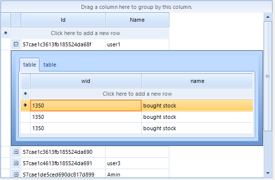 namespace TelerikGridView{ public partial class Form2 : Form { List<WatchTblCls> wts; List<UserCls> user; List<SymboleCls> symb; public Form2() { InitializeComponent(); wts = new List<WatchTblCls>(); user = new List<UserCls>(); symb = new List<SymboleCls>(); } private async void button1_Click(object sender, EventArgs e) { // add user into datagridview from MongoDB Colelction Watchtbl var client = new MongoClient("mongodb://servername:27017"); var database = client.GetDatabase("WatchTblDB"); var collectionWatchtbl = database.GetCollection<BsonDocument>("Watchtbl"); var collectionUser = database.GetCollection<BsonDocument>("Users"); //wts = await collectionWatchtbl.Find(x => true).ToListAsync(); //Get User Data var filter = new BsonDocument(); using (var cursor = await collectionUser.FindAsync(filter)) { while (await cursor.MoveNextAsync()) { var batch = cursor.Current; foreach (var document in batch) { user.Add(new UserCls() { Id = ObjectId.Parse(document["_id"].ToString()), Name = document["Name"].ToString() }); } } } //Get WatchTbl Data using (var cursor = await collectionWatchtbl.FindAsync(filter)) { while (await cursor.MoveNextAsync()) { var batch = cursor.Current; foreach (var document in batch) { wts.Add(new WatchTblCls() { Id = ObjectId.Parse(document["_id"].ToString()), UserId = document["userId"].ToString(), WID = document["wid"].ToString(), Name = document["name"].ToString() //Symbole }); } } } this.radGridView1.DataSource = user; this.radGridView1.Columns["fbId"].IsVisible = false; this.radGridView1.Columns["Pass"].IsVisible = false; } GridViewTemplate childTemplate; private GridViewTemplate CreateChildTemplate() { childTemplate = new GridViewTemplate(); this.radGridView1.Templates.Add(childTemplate); GridViewTextBoxColumn column = new GridViewTextBoxColumn("wid"); childTemplate.Columns.Add(column); column = new GridViewTextBoxColumn("name"); childTemplate.Columns.Add(column); childTemplate.AutoSizeColumnsMode = GridViewAutoSizeColumnsMode.Fill; return childTemplate; } private void Form2_Load(object sender, EventArgs e) { GridViewTemplate childTemplate = CreateChildTemplate(); this.radGridView1.Templates.Add(childTemplate); childTemplate.HierarchyDataProvider = new GridViewEventDataProvider(childTemplate); } private void radGridView1_RowSourceNeeded(object sender, GridViewRowSourceNeededEventArgs e) { foreach (GridViewRowInfo item in radGridView1.Rows) { var itll = item.Cells["id"].Value.ToString(); foreach (var itemWts in wts) { if (itll == itemWts.UserId.ToString()) { GridViewRowInfo row = e.Template.Rows.NewRow(); row.Cells["wid"].Value = itemWts.WID.ToString(); row.Cells["name"].Value = itemWts.Name.ToString(); //symbole e.SourceCollection.Add(row); } } } } } public class WatchTblCls { [BsonId] public ObjectId Id { get; set; } public string UserId { get; set; } public string WID { get; set; } public string Name { get; set; } public List<SymboleCls> Symbols { get; set; } } public class UserCls { [BsonId] public ObjectId Id { get; set; } public string fbId { get; set; } public string Name { get; set; } public string Pass { get; set; } } public class SymboleCls { [BsonId] public ObjectId Id { get; set; } public string Name { get; set; } }}