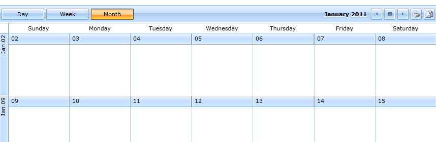 I'm having an issue with the January months from 2011 and earlier in the Month view of the RadScheduleView. The issue (as shown in the attachment for January 2011) is that any days before the first Sunday of the month do not display. As you can see in January 2011, January 1st gets cut off even though the VisibleDateRange in code shows 12/26 - 2/6. In January 2010, January 1st and 2nd get cut off and in January 2009, January 1st-3rd get cut off and so on. January 2012 works fine as January 1st is the first Sunday of the month.