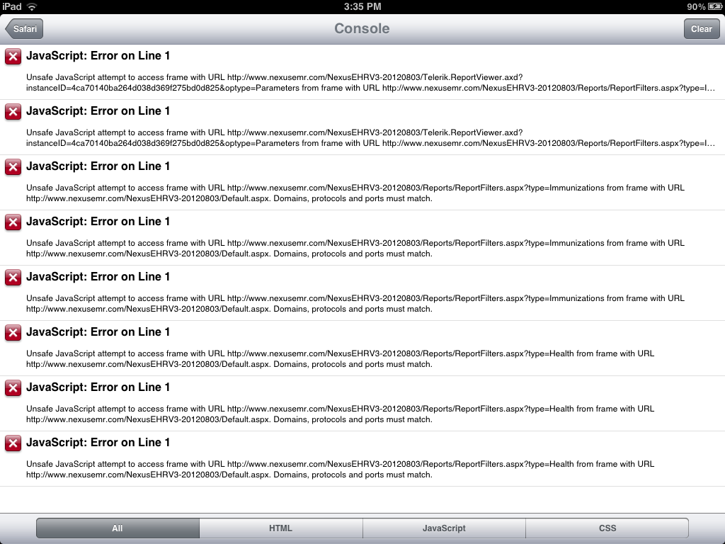 2- Unsafe JavaScript attempt to access frame with URL http://www.nexusemr.com/NexusEHRV3-20120803/Telerik.ReportViewer.axd?instancelD=4ca70140ba264d038d369f275bd0d825&optype=Parameters from frame with URL