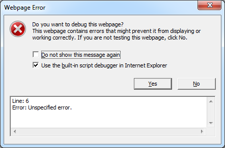 I get the IE dialog about debugging and if I ignore the error, everything seems to work correctly from that point on.